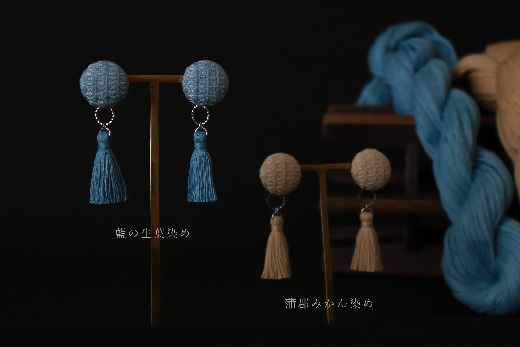 手織り三河木綿×藍・蒲郡みかん染めタッセルピアス/イヤリング 草木染め [受注制作]