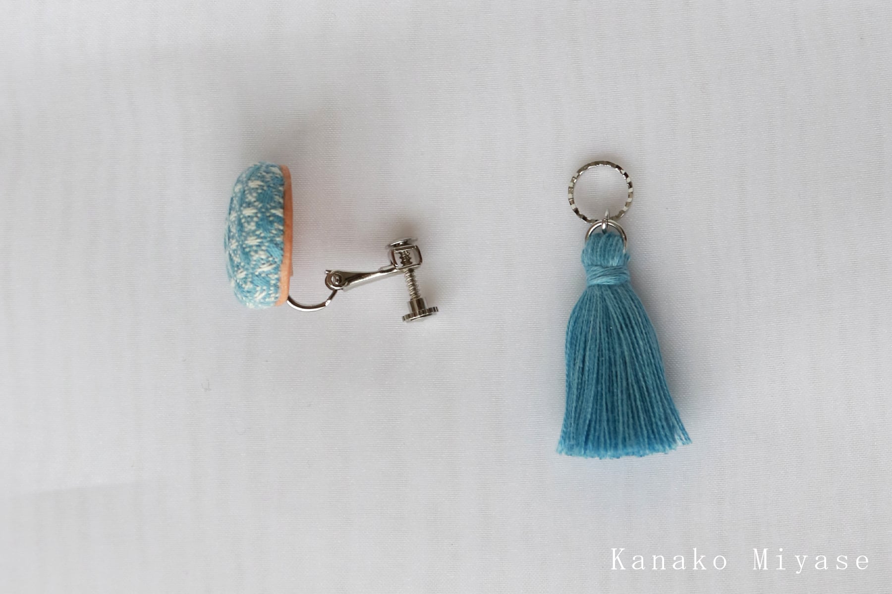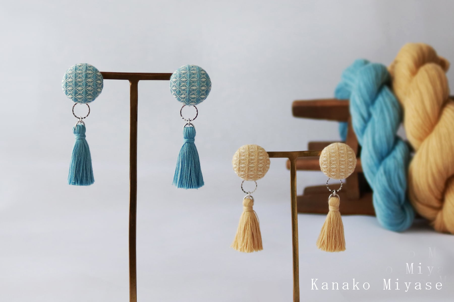 素材:手織り三河木綿 / ヌメ革 / ピアス(チタンポスト・樹脂キャッチ)・イヤリング(真鍮) / 綿糸(タッセル)